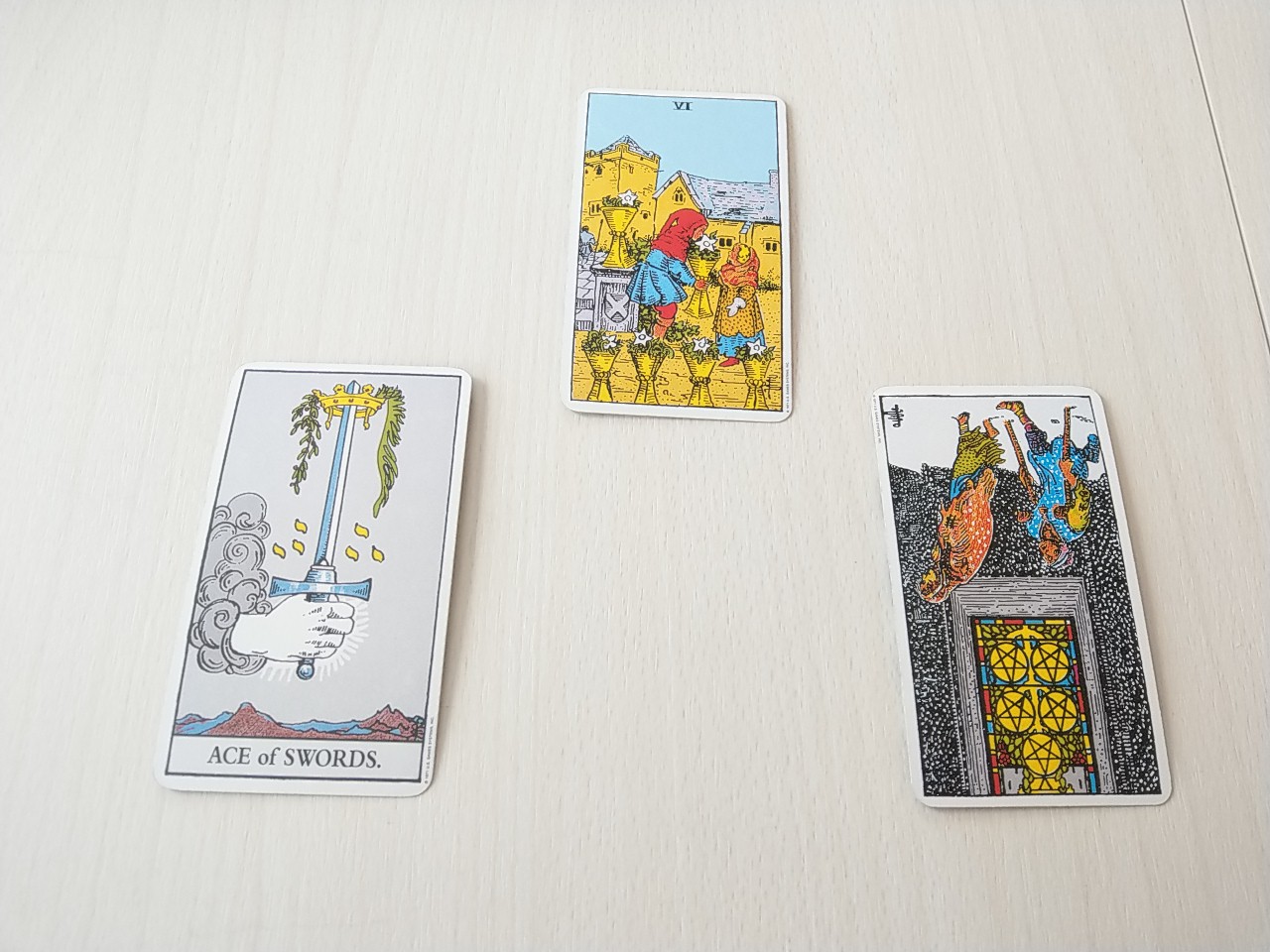 カードは、カップの6、ソードのエース、ペンタクルの5です。