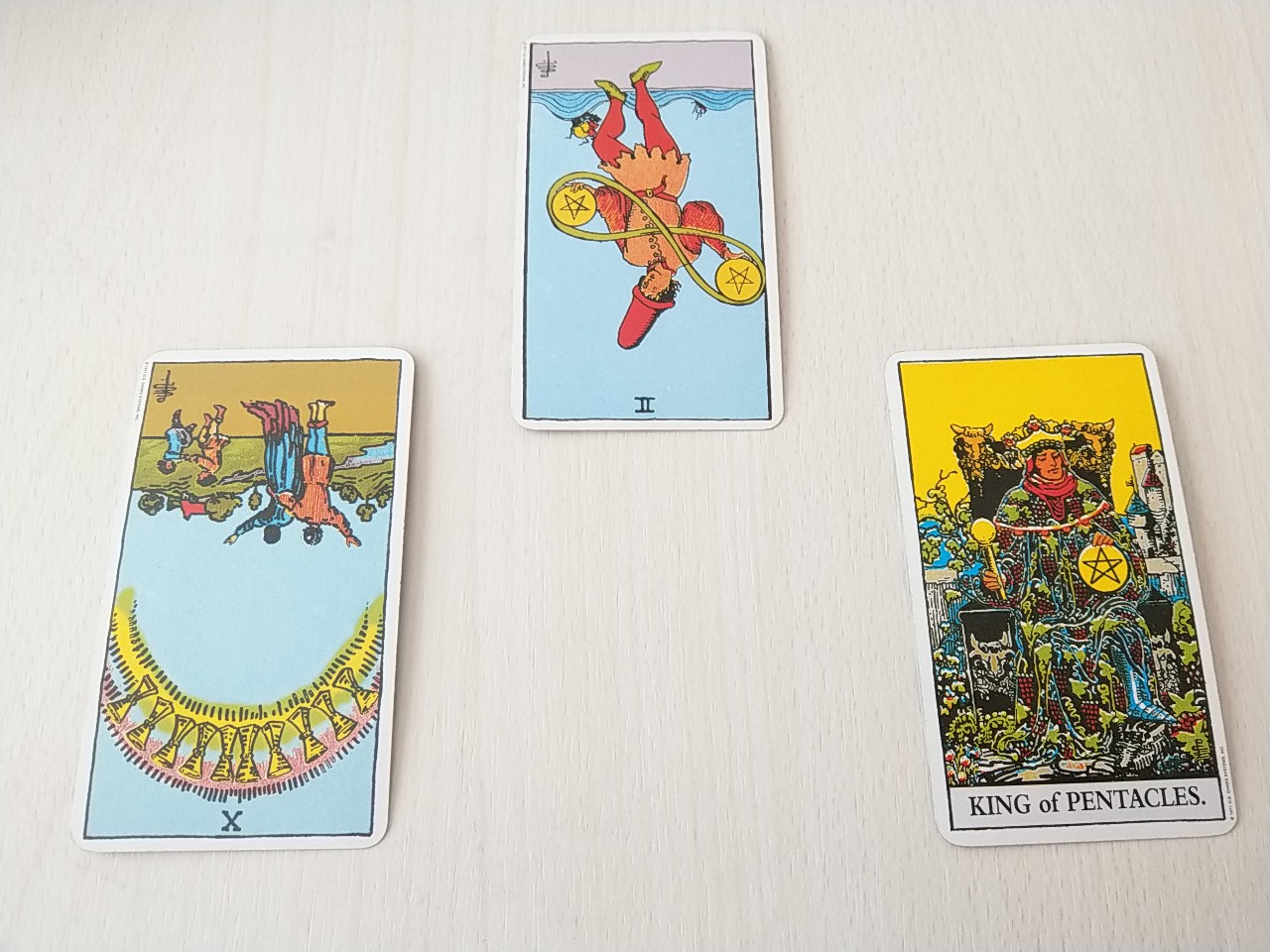 カードは、ペンタクルの2、カップの10、ペンタクルのキングです。