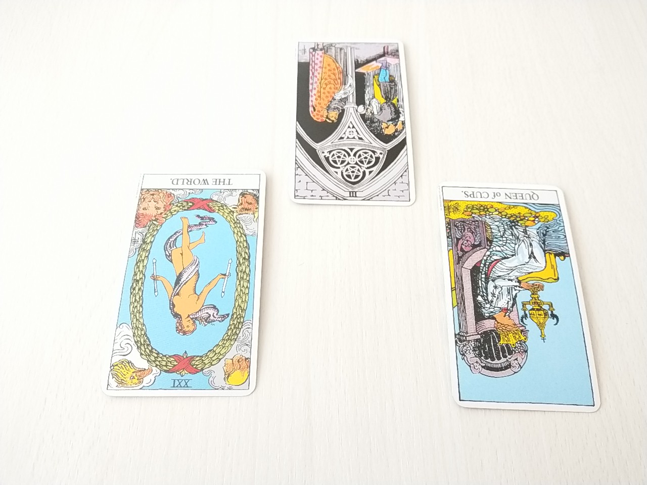 カードは、ペンタクルの3、ワールド、カップのクイーンです。