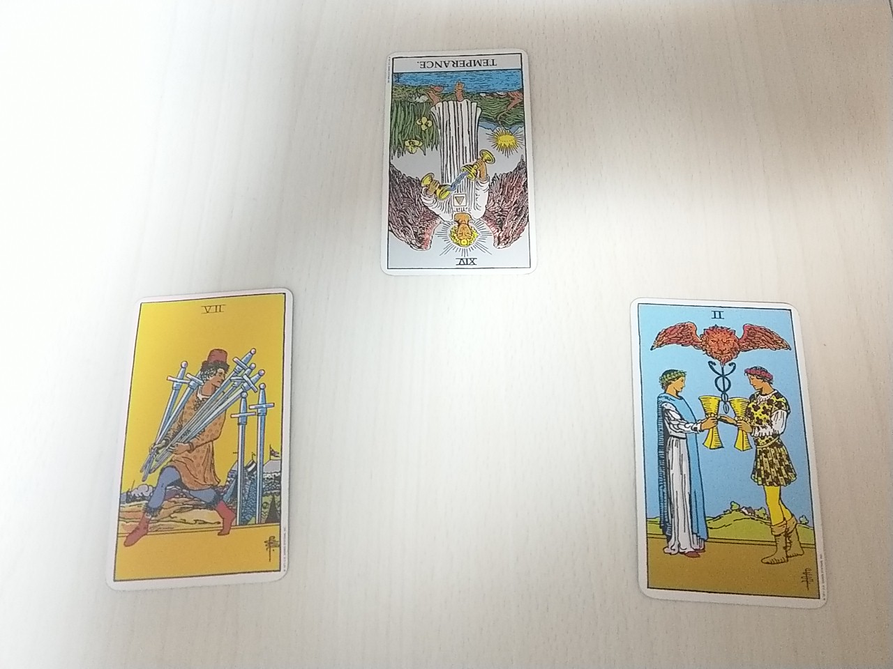 カードは、テンペランス、ソードの7、カップの2です。