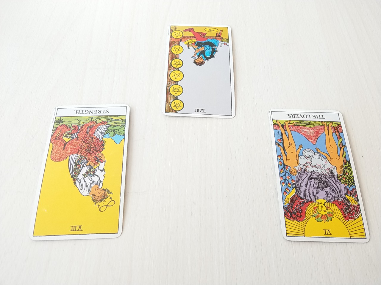 カードは、ペンタクルの8、パワー、ラバーズです。