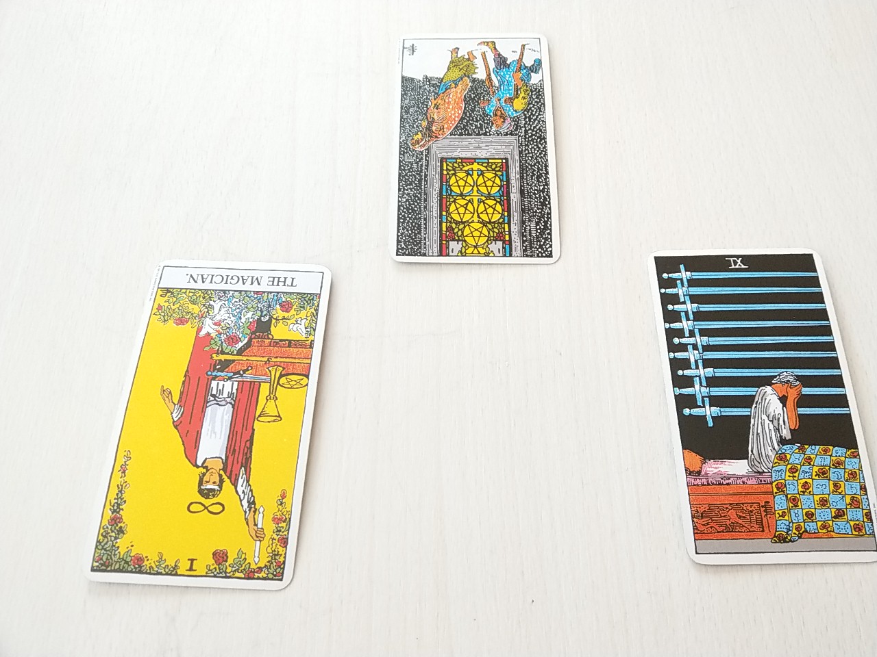 カードは、ペンタクルの5、マジシャン、ソードの9です。