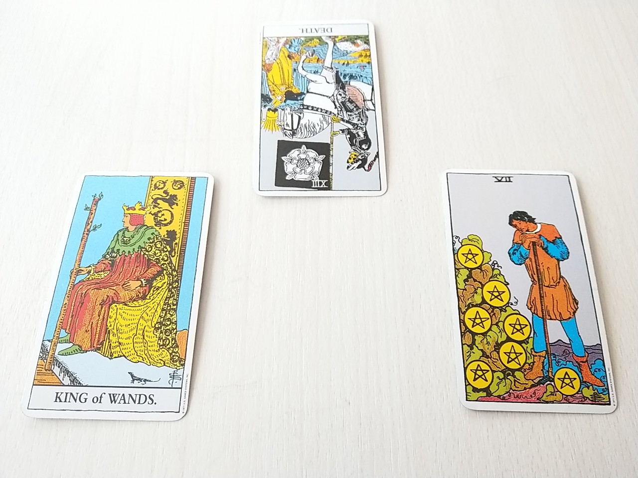 カードは、ワンドのキング、ペンタクルの7です。