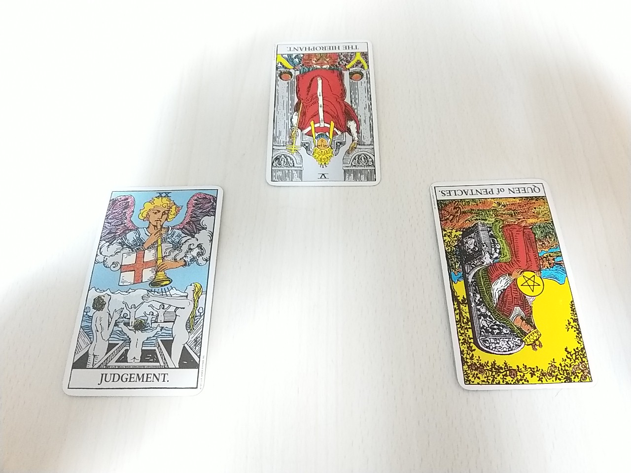 カードは、ハイエロファント、ジャッジメント、ペンタクルのクイーンです。